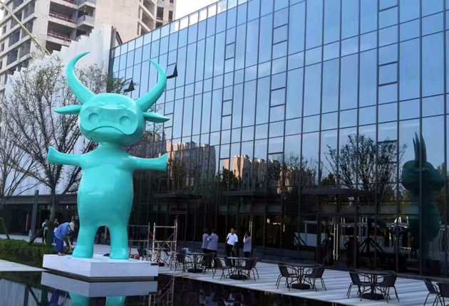 《金融牛寓意雕塑》高6.8米不锈钢材质,安装与安阳IFC国际金融中心,采用锻造工艺技术,采用国标#304不锈钢手工锻造,内部钢结构支撑,总高6.8米,整体焊接、烤漆工艺,带有时尚的现代景观感,非常吸引眼球。