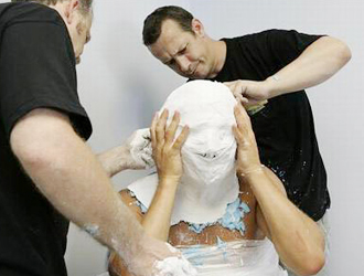 *用泥雕塑出人物的肖像 * 翻制石膏模具,做出石膏肖像 *对石膏肖像进行细节刻画 *在石膏像上开具硅胶模具 *在硅胶模具里面倒入3—5遍的液体硅胶 *让硅胶达到一定的厚度,并均匀 *取出硅胶像,进行细节修复 |